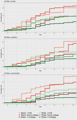 Contacts with the criminal legal system have consequences for a host of outcomes. Still, early life age patterns of system involvement remain to be better understood. We estimate cumulative risks of arrest, probation, and incarceration from childhood through early adulthood and assess disparities by race/ethnicity, gender, and parental education. Data come from the Transition to Adulthood Supplement of the Panel Study of Income Dynamics (n = 2,736). We use Kaplan–Meier curves and Cox regression models to estimate cumulative risks of arrest, probation, and incarceration across the early life course and document disparities by race/ethnicity, gender, and parental education, as well as at their intersections. Criminal legal system involvement is common among recent cohorts, but Black and Latinx boys and young men face especially high risks. Among Black men whose highesteducated parent completed high school or less, an estimated six in ten had been arrested, four in ten had experienced probation, and four in ten had been incarcerated by age 26. Among Latinx men whose highest-educated parent completed high school or less, an estimated four in ten had been arrested and one in four had been incarcerated by age 26. Black women also experienced high risks, with an estimated one in four arrested by age 26. We document early life patterns of criminal legal system involvement among young people who came of age during the expansion of proactive policing and mass incarceration in the United States, providing important context for understanding the role of the system in generating and exacerbating life course inequalities.
